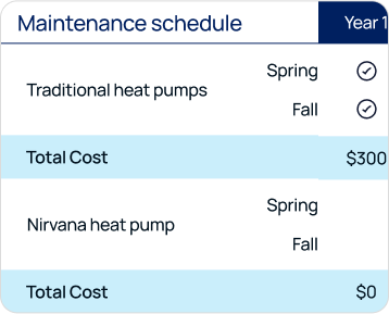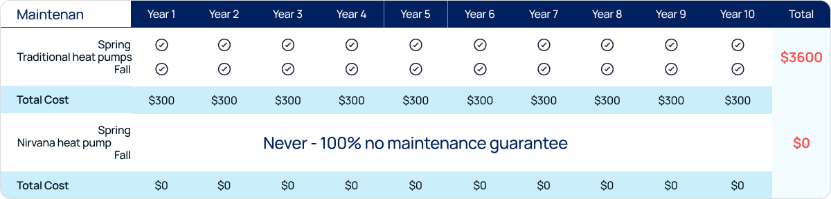 The Nirvana Home Comfort System’s maintenance-free design does not require seasonal or even annual check ups from trained HVAC technicians.